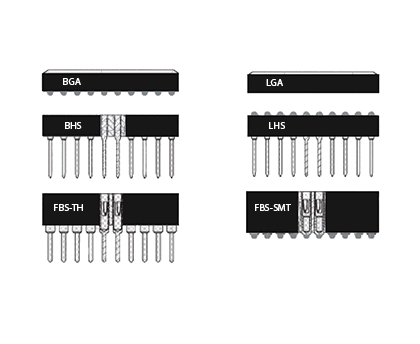| LHS + FBS | Interposer-style solution for LGA interfaces or SMT BGA footprints using solder balls on the adapter. |